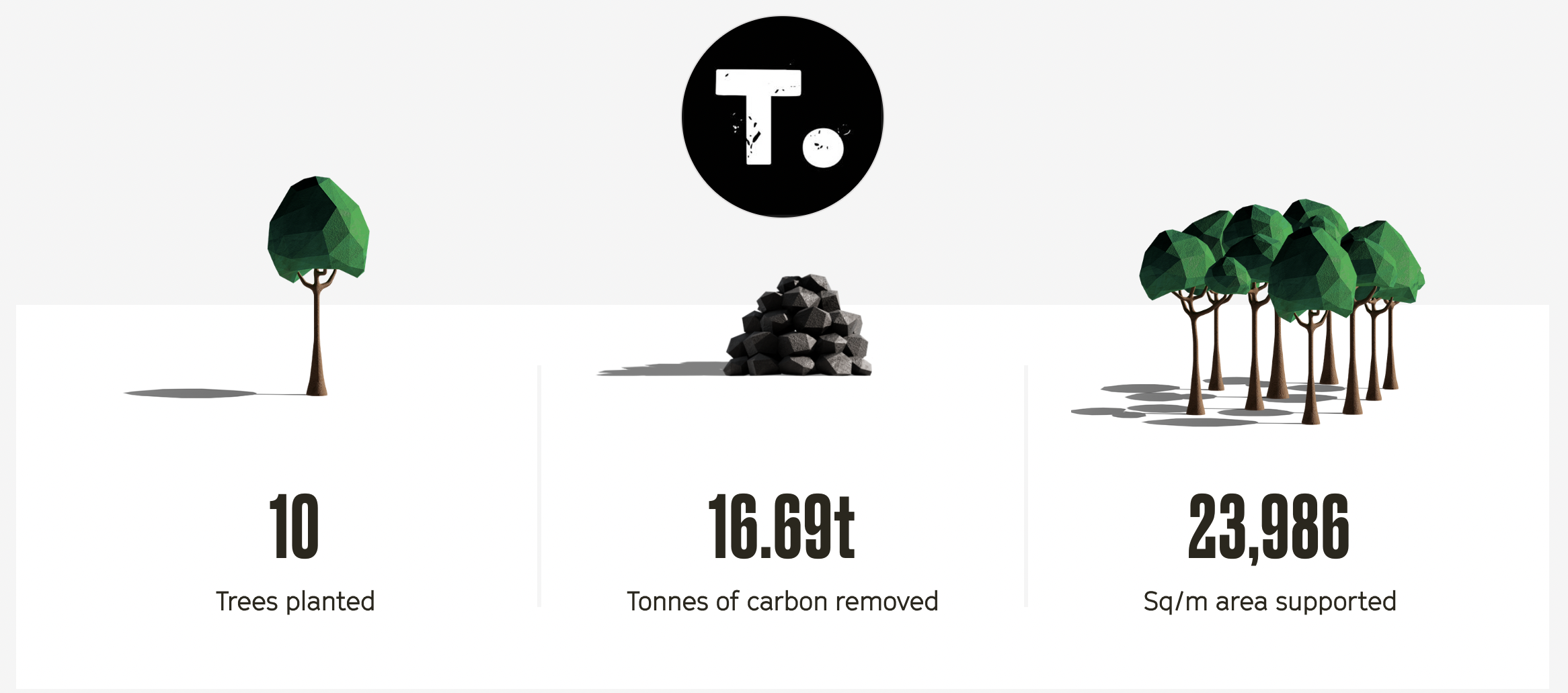 As part of our partnership, we plant a tree for every bottle sold to offset the carbon footprint of each employee. Its also offsetting our production process, as well as our transportation of the product.